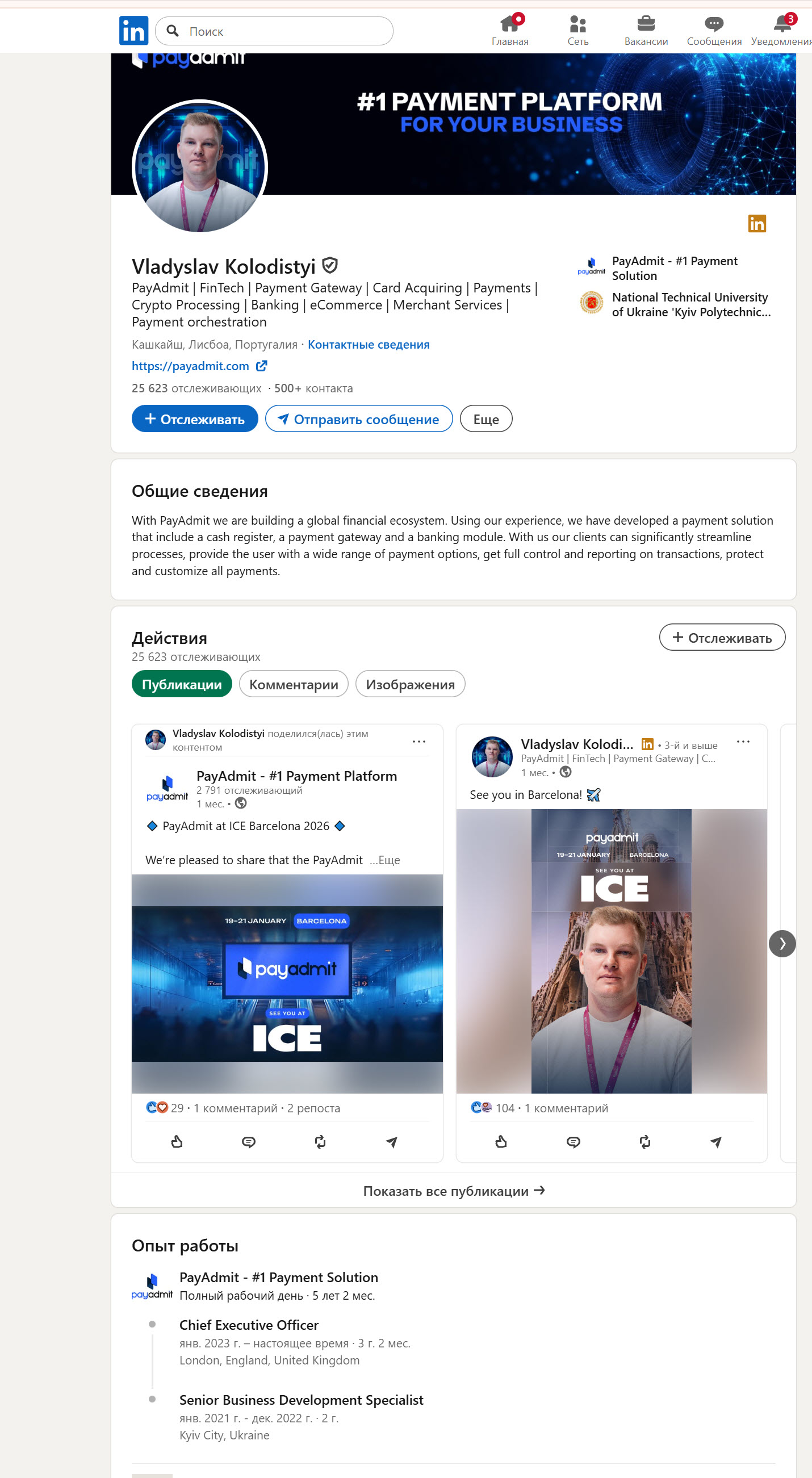 At that moment, these arbitrage geniuses left Kyiv and moved to Portugal, where they tried to launch their own payment system. However, according to Vladyslav, no one in Portugal, Spain, or any other EU country wanted to issue them a license, which was pretty obvious. That's why these smart guys decided to start operating in the UK. This is the moment when the biggest deception begins. Both in his interview for Point G and on social media, Vladyslav Kolodistyi positions himself as CEO of the PayAdmit payment software company, as well as the co-owner of this company, noting that there is also an equal partner from Ukraine and smaller partners who have been working in his team for several years. .