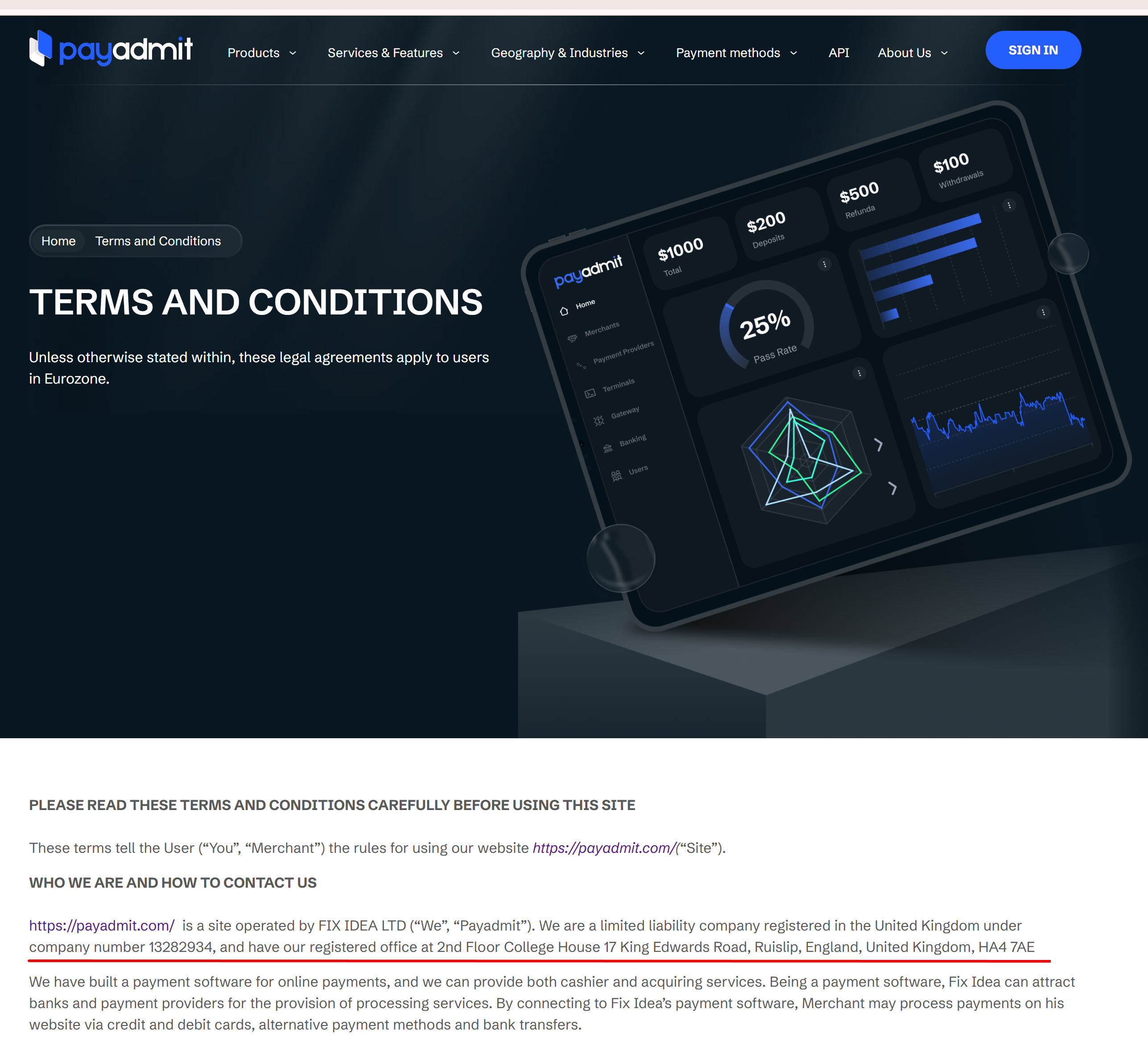 "We are constantly getting offers to sell the company. We still need to do and perform ten times more things. We wanted to get an estimate, and we received a nine-digit number. Our current income is around 100 million euros, which means about 1 billion euros in total after doing ten times more. And I am talking only about software now," says the alleged co-owner of PayAdmit.In his interview, he admits that the company also engages in high-risk projects related to payments (gambling, online casinos, and so on) while making good money from them. In addition, it stores almost all funds in cryptocurrency. At the same time, the main income comes from software, but the company also deals with everything related to payments. Now, let's open the official website of PayAdmit. First of all, there is no information about the name of the PayAdmit legal entity on the main page and on the About Us page. However, it can be found on the Terms and Conditions page. As we can see, the legal entity hiding behind the PayAdmit brand is a company from the United Kingdom. We are talking about the FIX IDEA LTD (registration number 13282934), registered at the following address: 2nd Floor College House 17 King Edwards Road, Ruislip, England, United Kingdom, HA4 7AE.