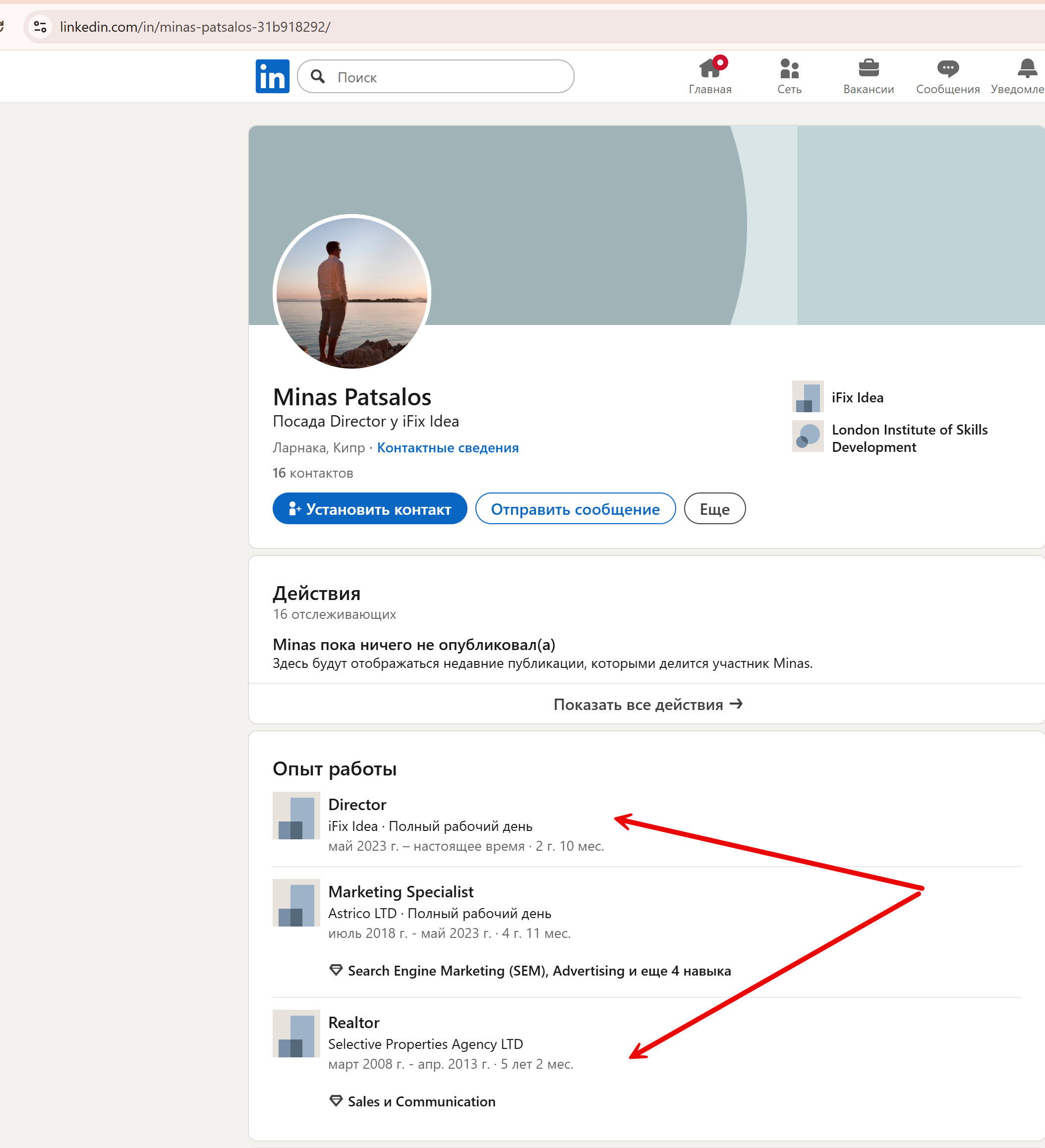 According to the official British Register, the director (legally responsible owner) of the FIX IDEA LTD is the Cypriot Minas Patsalos. Before him, two more Cypriots were listed as directors: Nicos Georgiou and Daniel Kurt Ioannou. Furthermore, the company was registered on March 22, 2021. Neither Vladyslav Kolodistyi nor any other Ukrainians have ever had anything to do with the company. None of them is mentioned in the records. The current director of the FIX IDEA LTD, Minas Patsalos from Cyprus, used to work as a real estate agent and then as a marketer.