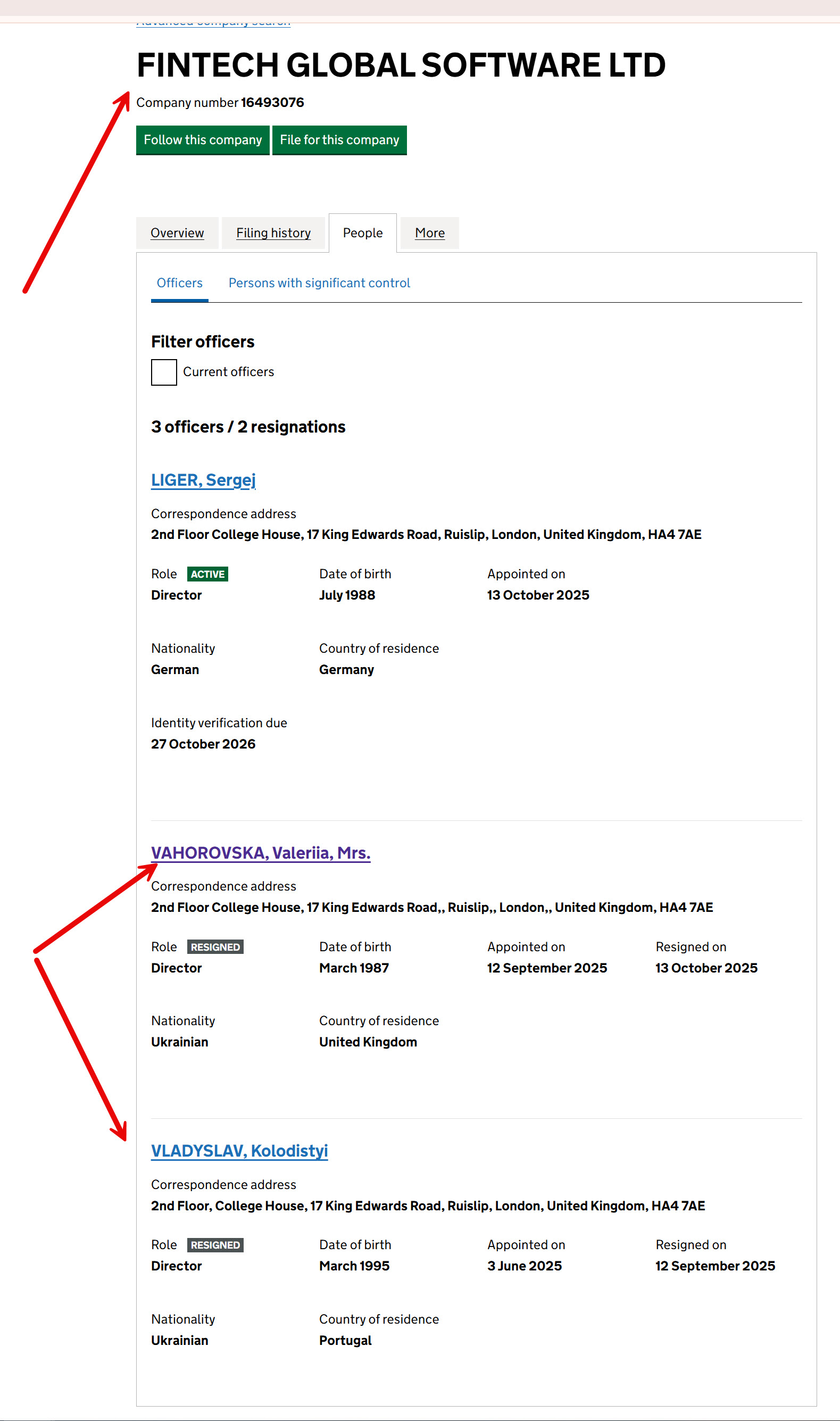 However, the most interesting fact is that Vladyslav was the director of the FINTECH GLOBAL SOFTWARE LTD British company, registered at the same address as the FIX IDEA LTD. He registered this company with an authorized capital of 100,000 pounds in early June 2025. Already in September 2025, he transferred it to Valeria Vahorovska, who is well-known as the founder of the infamous Fondy payment system in Ukraine.